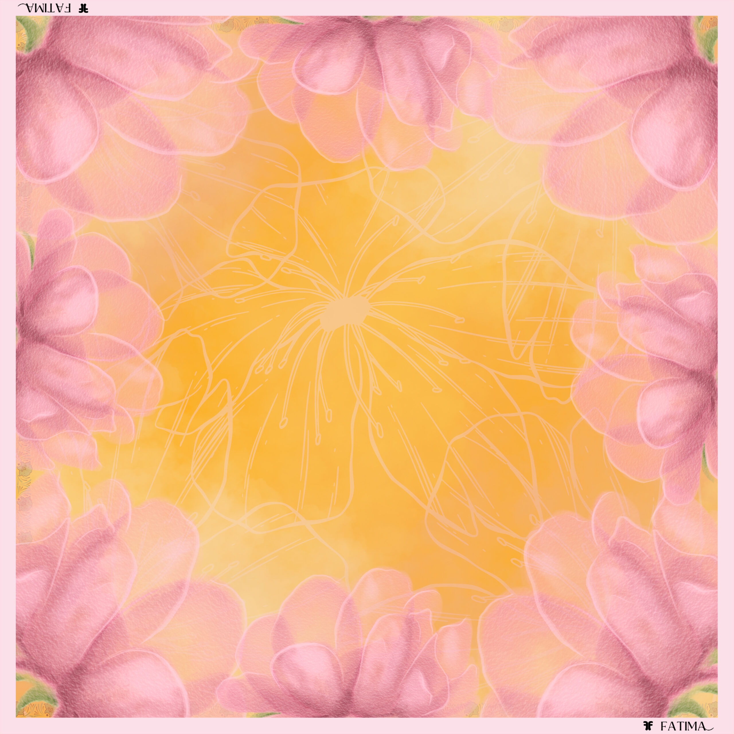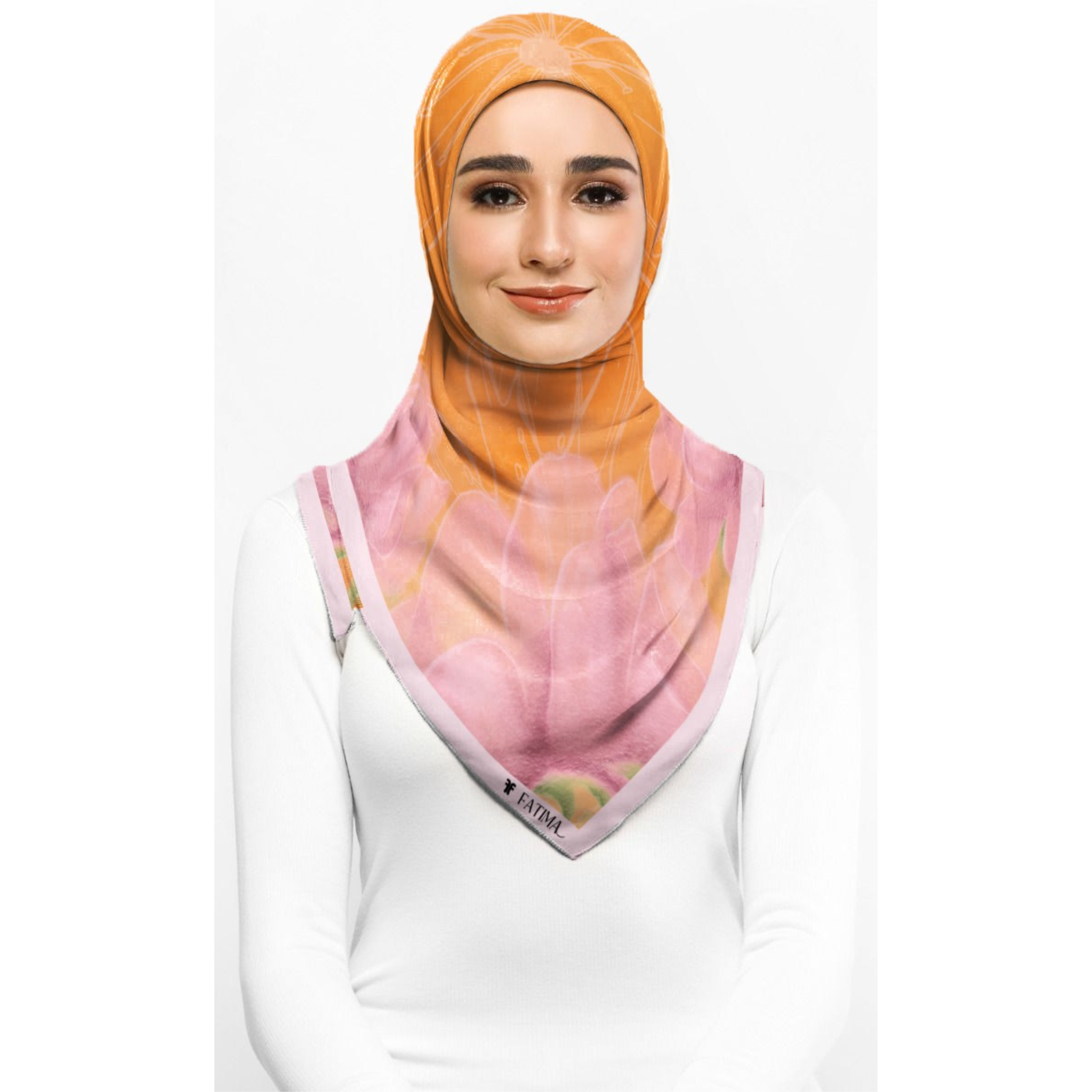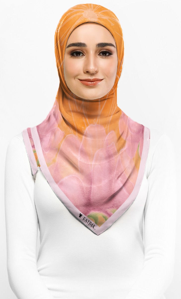 berlatarkan warna oren dan bunga tulip pink melambangkan kebahagiaan, bersemangat dan ‘friendly’ kepada si pemakai.